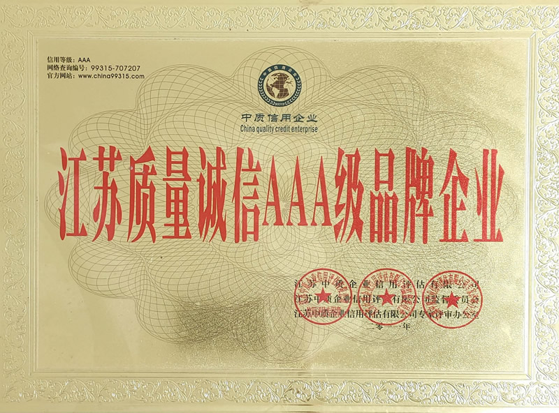 江苏省质量诚信AAA品牌企业证书