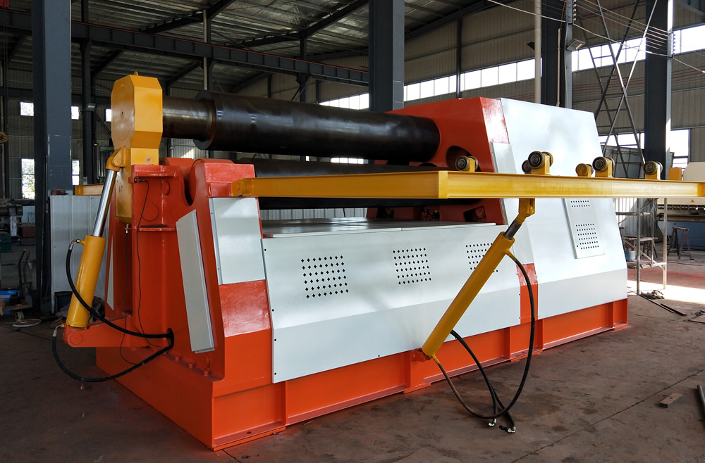 四辊卷板机用于制造压力容器、机械、水电、建筑等行业的筒体的预弯、卷圆,同时具有校圆、校平功能。上辊液压马达方式主传动,通过钢板与辊子之间的磨擦力带动下辊、侧辊转动,为卷圆提供扭矩。下辊、侧辊、翻倒架液压驱动。下辊垂直升降、侧辊倾斜弧线升降。预弯通过下辊上升夹住钢板,侧辊倾斜上升实现板材端部预弯。