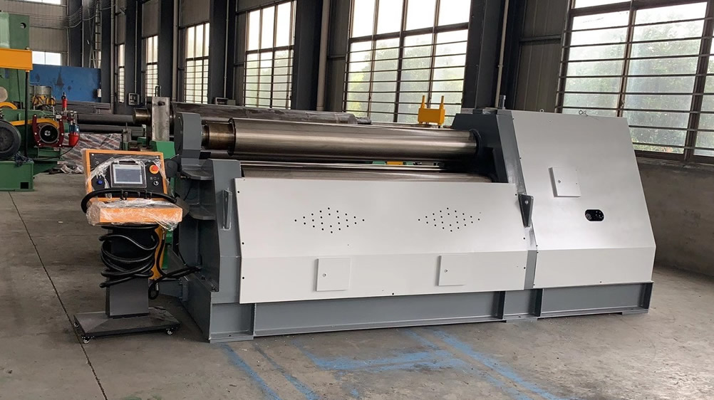四辊卷板机用于制造压力容器、机械、水电、建筑等行业的筒体的预弯、卷圆,同时具有校圆、校平功能。上辊液压马达方式主传动,通过钢板与辊子之间的磨擦力带动下辊、侧辊转动,为卷圆提供扭矩。下辊、侧辊、翻倒架液压驱动。下辊垂直升降、侧辊倾斜弧线升降。预弯通过下辊上升夹住钢板,侧辊倾斜上升实现板材端部预弯。